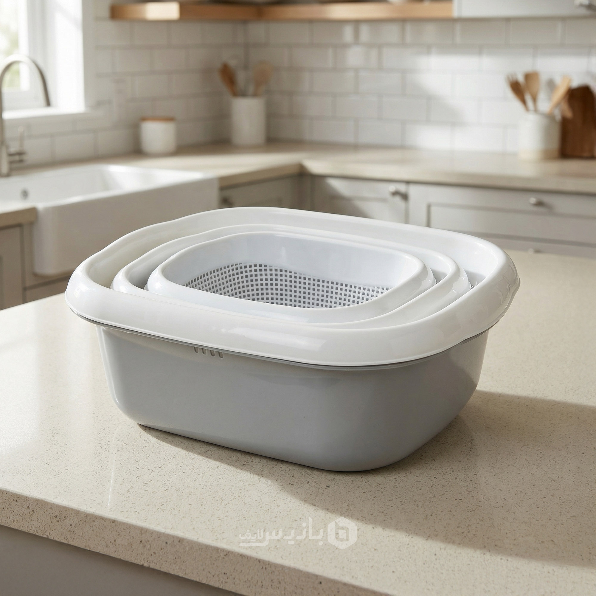 جنس پلاستیکی سبک، یک مزیت مهم برای استفاده روزمره است؛ چون حمل لگن و آبکش پر از آب را سادهتر میکند و شستوشوی آنها با دست یا داخل سینک بدون نگرانی از زنگزدگی انجام میشود. در عین حال، اگرچه این متریال برای استفاده عادی کاملاً مناسب است، اما بهتر است از تماس مستقیم با شعله و اجسام خیلی داغ یا ضربههای شدید جلوگیری شود تا عمر محصول بیشتر شود. طراحی چهارگوش و لبههای نسبتاً پهن، کنترل هنگام جابهجایی و تخلیه آب را راحتتر کرده و سایزهای بزرگتر عملاً میتوانند مانند یک سبد سینک عمل کنند؛ مخصوصاً برای شستوشوی سبزی و میوه یا نگهداری ظروف سبک داخل سینک، بدون تماس مستقیم با کف آن.