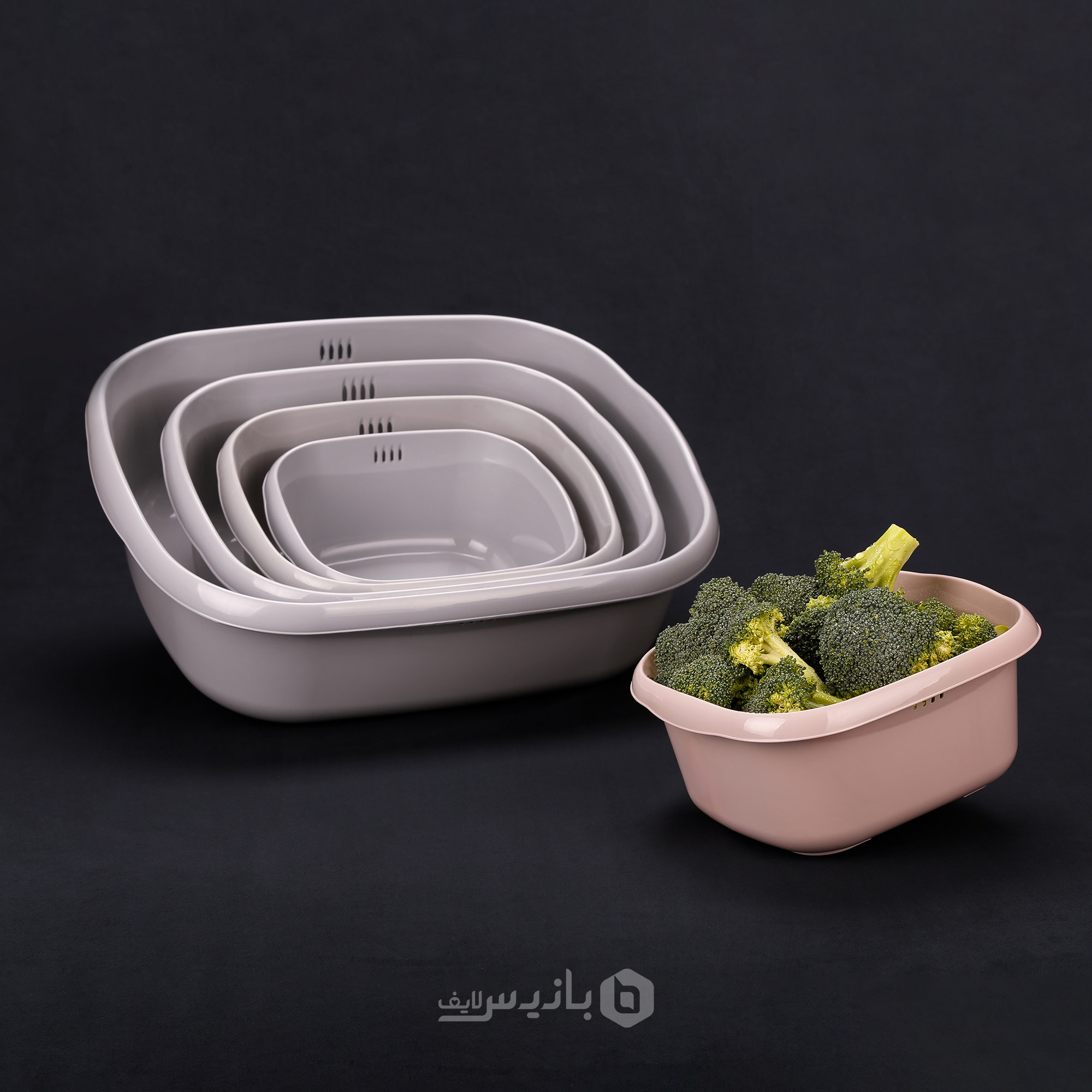 ست ۸ پارچه شامل چهار آبکش و چهار لگن چهارگوش هماهنگ، مناسب انواع کارهای شستوشو، آبکشی و خیساندن مواد غذایی.