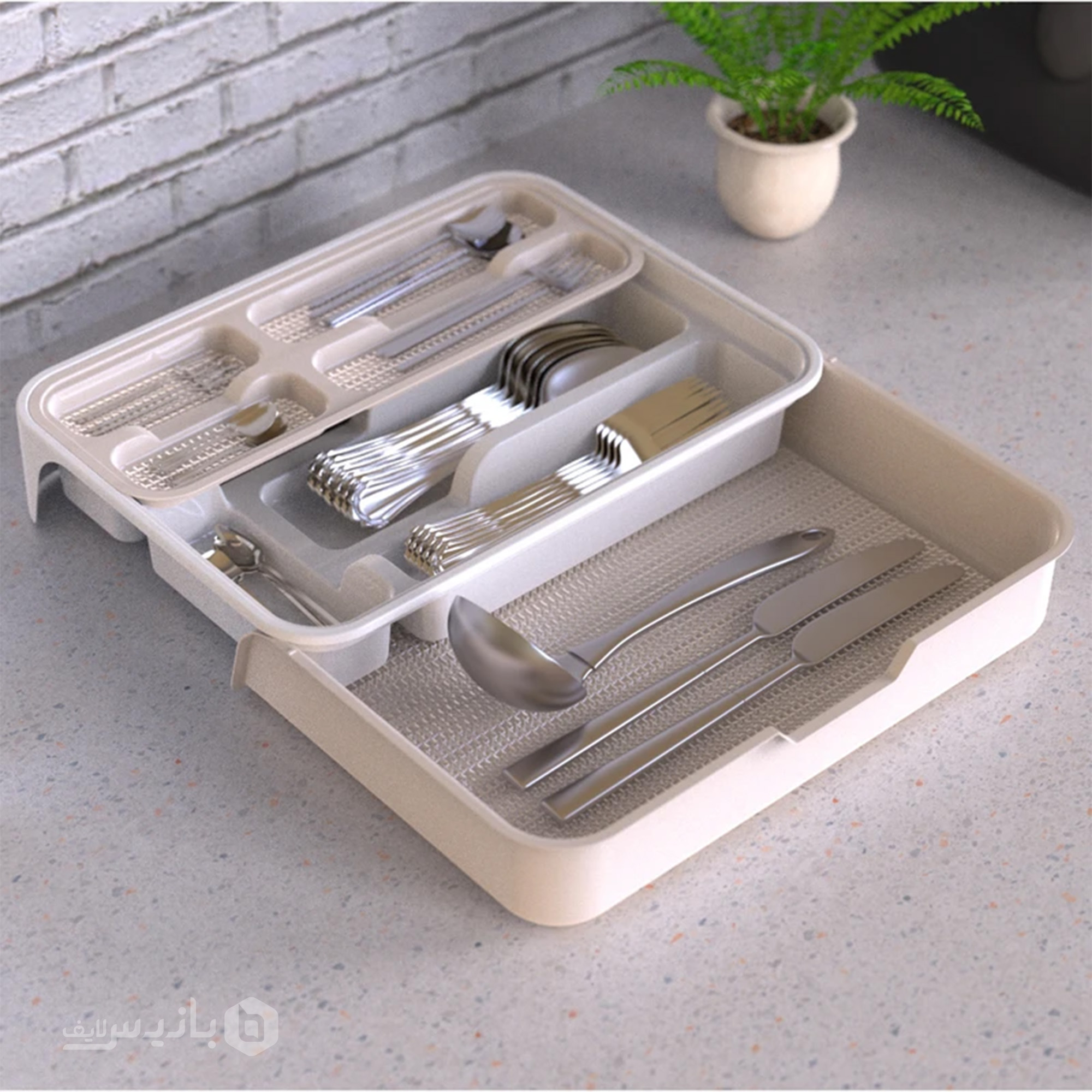 کیفیت پلاستیک استفادهشده در این محصول معمولا در سطح خوبی قرار دارد و برای استفاده روزمره، شستوشو و جابهجایی مداوم، مقاومت کافی را ارائه میدهد. طراحی چندبخشی داخلی باعث میشود هر نوع قاشق، چنگال، کارد یا ابزار کوچک آشپزخانه خانهی مخصوص خودش را داشته باشد و هنگام کار، زمان کمتری برای پیدا کردن وسیله مورد نیاز صرف کنید؛ این ویژگی برای خانوادههای پرجمعیت یا کسانی که سرویسهای متعدد دارند، مزیت بزرگی است.